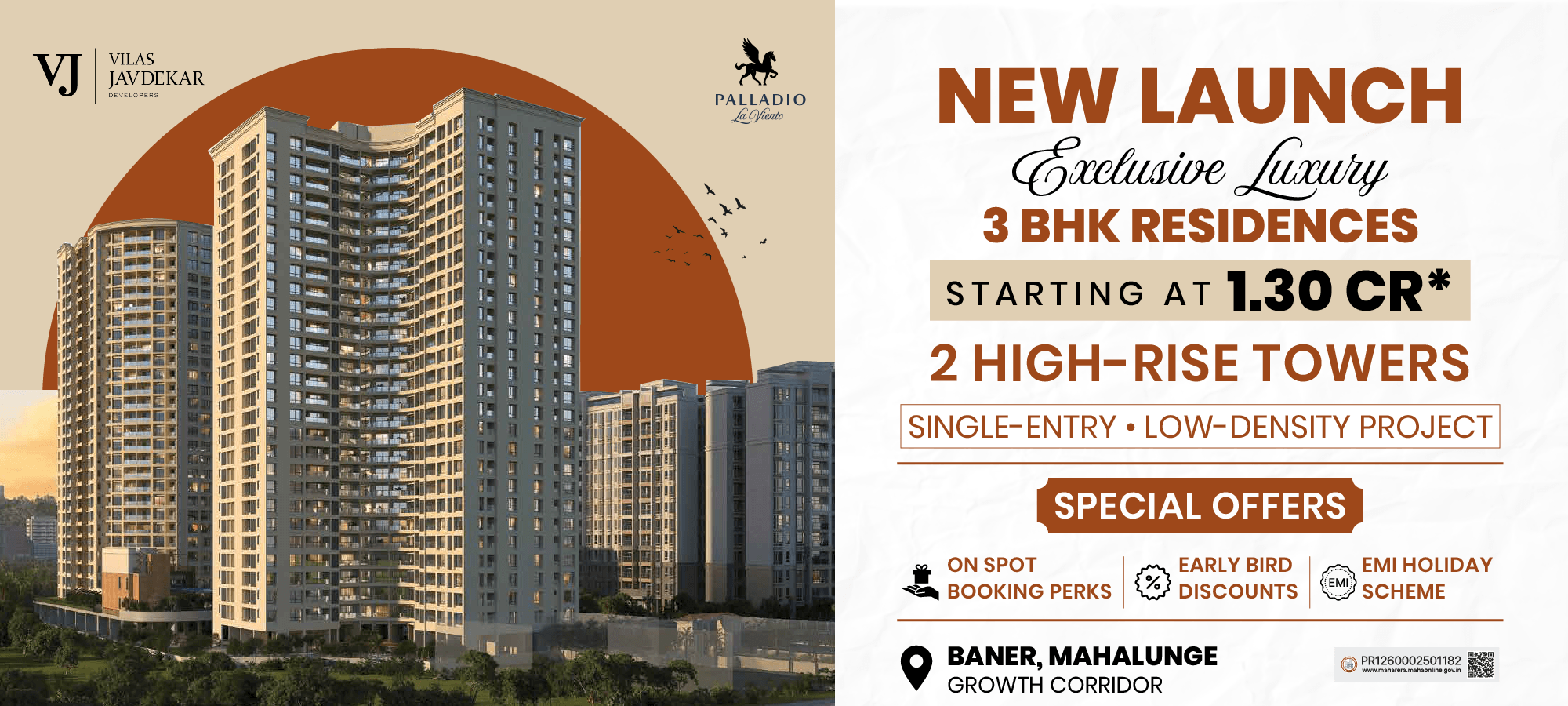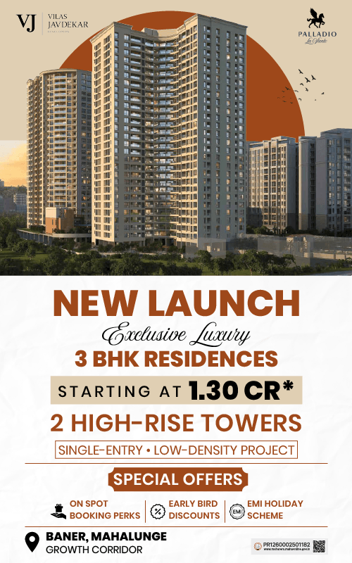 Palladio La Viento by Vilas Javdekar Developers offers exclusive 3 BHK residences in the Baner–Mahalunge Growth Corridor, Pune. Spread across two elegant high-rise towers, these spacious homes (930–1058 sq.ft.) come with smart home automation, IAQ+ air purification, and motion-sensing lights. Designed around 5 wind-themed lifestyle courts and a grand 3-level Club La Viento, the project includes premium amenities like a swimming pool, jogging track, pet park, and kids’ play zones. Each residence offers panoramic sunrise, sunset, and cityscape views, bringing nature and serenity into everyday living. Located just 6 mins from Balewadi Metro and surrounded by 2L+ professionals, top IT parks, schools, and hospitals, it’s where modern luxury meets urban convenience.